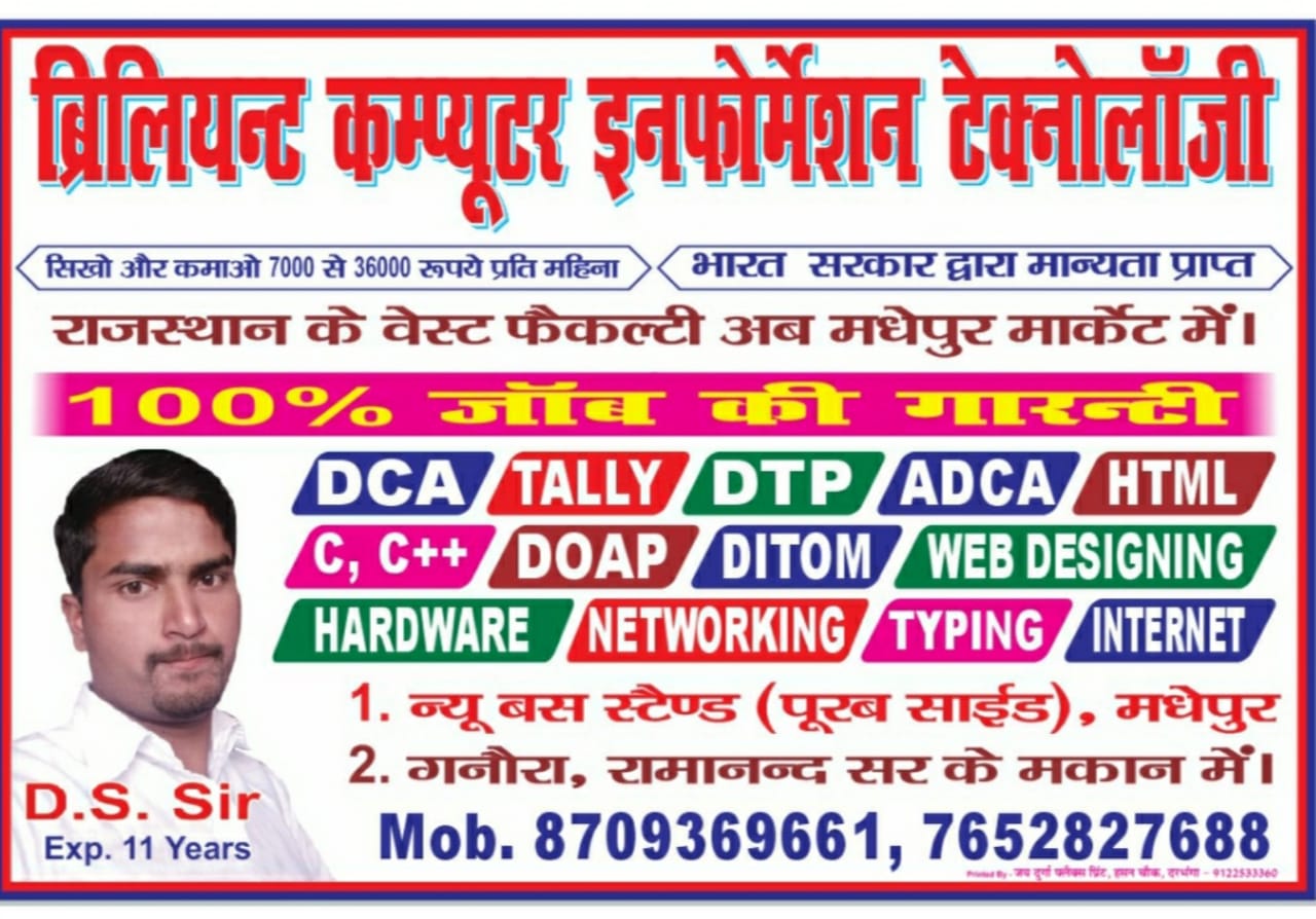 Welcome to Brilliant Computer Information Technology Block Road Madhepur me pati par chlna chaulye